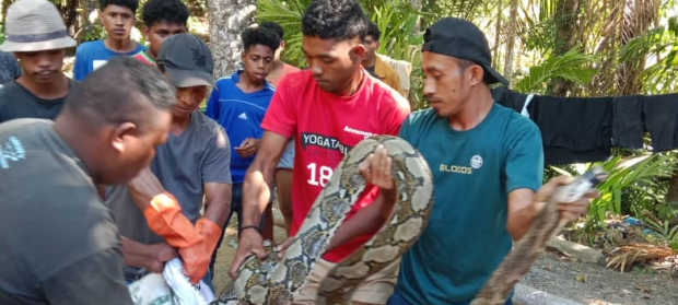 | Komunidade husi Aldeia Lakudala, Suku Lakuliu Posto Administrativo Quelicai Municipio Baucau sente la hakmatek tamba lakon sira nia animal ne’ebe mak sira hakiak hanesan Bibi no Asu. animal hirak nee lakon cauza husi Foho Rai mak han. Ho nunee Komunidade sira deside atu kaer Foho Rai refere depois intrega ba iha Ekipa DNB atu haloot iha fatin seluk nebe mak seguru. Samea/foho rai (python Reticulatus) ho nia naruk Metru 3,50. Samea ne’ebe mak Intrega ba Ekipa DNB ho kondisaun diak. |